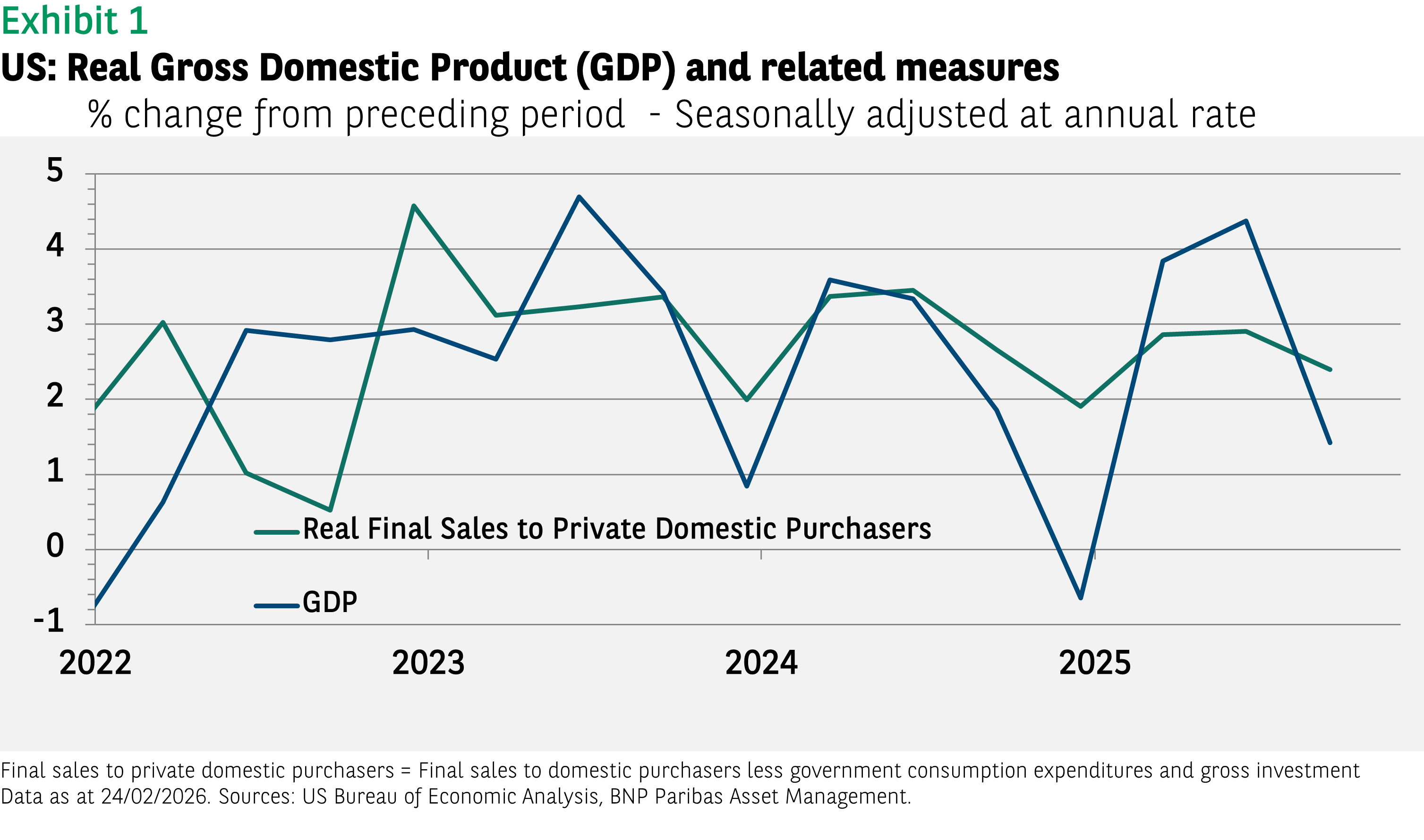 Selon une récente estimation préliminaire, la croissance du PIB américain s'est établie à 1,4 % au quatrième trimestre (taux annuel corrigé des variations saisonnières). Ce chiffre marque à la fois un ralentissement par rapport aux 4,4 % enregistrés au T3 et une déception par rapport aux estimations consensuelles. En revanche, les données sous-jacentes sont plus encourageantes. Tout d'abord, une part importante de la croissance trimestrielle du PIB (-0,9 point de pourcentage) a été freinée par la baisse de la consommation et des dépenses de l'État fédéral suite à la paralysie budgétaire partielle de l'administration. Deuxièmement, la volatilité des ventes finales réalisées auprès des acheteurs privés sur le marché intérieur a été beaucoup moins forte que celle du PIB. La demande intérieure privée (consommation plus investissement) se maintient autour des 2,5 % depuis deux ans, signe de la bonne tenue de la croissance américaine.