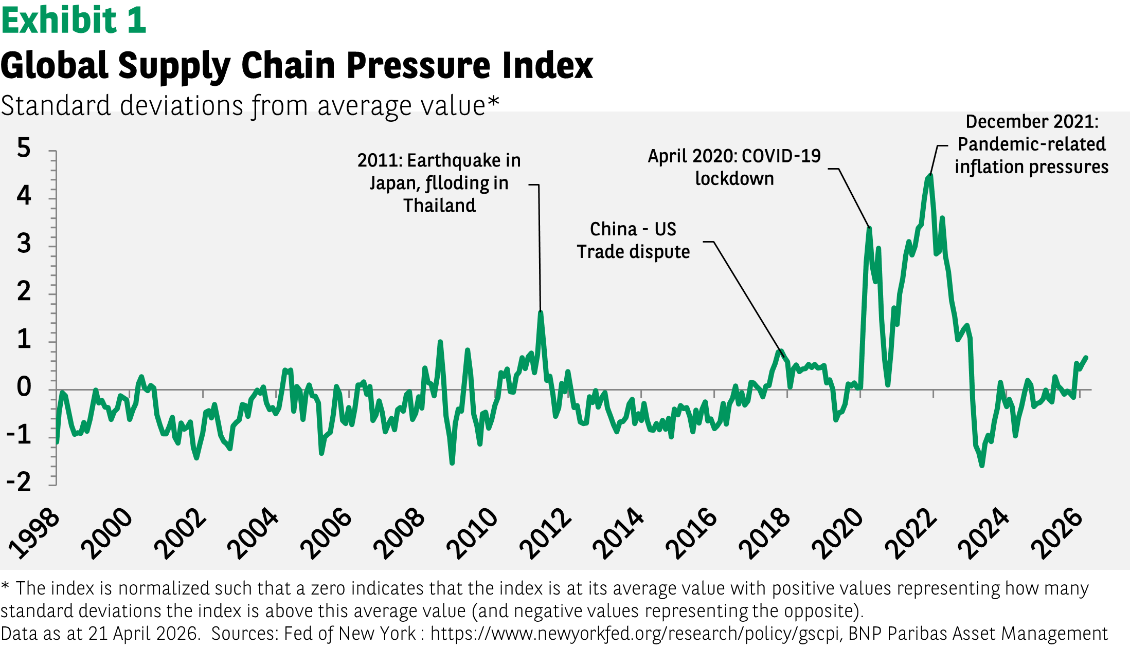 In 2022 creëerde de Federal Reserve van New York een index om de situatie van de wereldwijde aanvoerketens te meten. Deze index analyseert transportkosten (vrachtvervoer over zee en via het vliegtuig) en subcomponenten zoals leveringstijden, orderboeken en voorraadgegevens, op basis van peilingen van de bedrijvigheid zoals PMI's. De stijgende olieprijzen door het conflict in het Midden-Oosten en de aanzwellende voorraden door de prijs- en aanbodproblematiek deden de index in maart stijgen tot 0,68 , het hoogste niveau sinds januari 2023. Dit blijft echter ver onder het niveau dat we in 2021-2022 zagen toen de inflatie na de pandemie fors omhoog ging. De gegevens van april, die begin mei bekendgemaakt worden, zullen meer duidelijkheid verschaffen over de vraag of de groeiende druk op de internationale aanvoerketens de wereldwijde economische groei in gevaar dreigt te brengen.