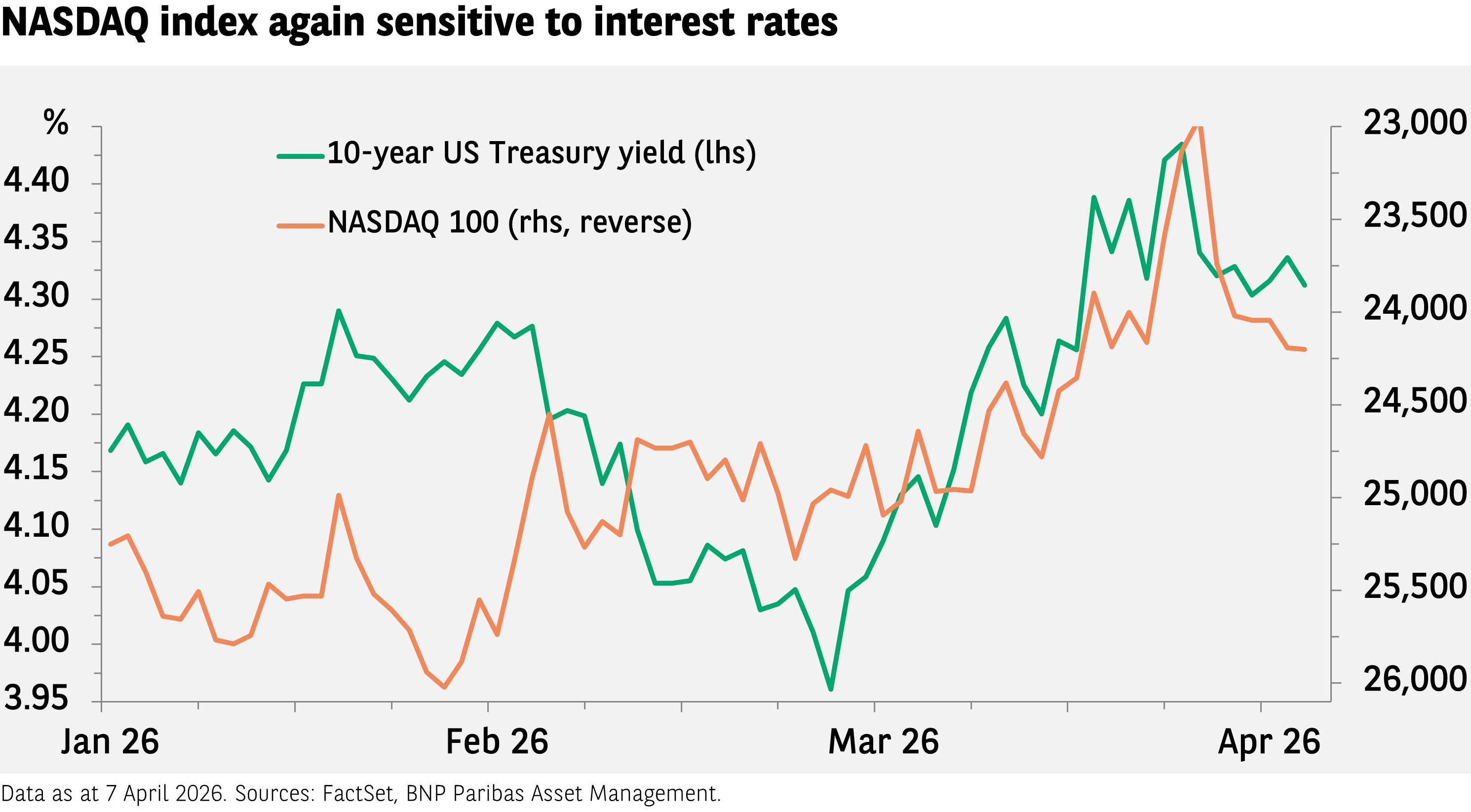 De bedrijfswinsten zijn uiteraard fundamenteel voor de prestaties van de technologieaandelen, maar ook de waarderingen zijn van belang, en de rente speelt in dat verband een belangrijke rol. Dit bleek duidelijk in 2022 toen er na de pandemie een periode van inflatie volgde, waardoor de rente steeg en de Nasdaq 100 fors naar beneden ging. Tot voor kort liet de technologie-index zich voornamelijk leiden door het verwachte effect op de winstcijfers van de doorbraken op het gebied van AI. Maar de afgelopen weken is de Nasdaq gezakt doordat de inflatievrees toenam. Als de situatie in het Midden-Oosten blijft verbeteren, zal ook de rente weer naar beneden gaan, wat gunstig zou moeten zijn voor de index.