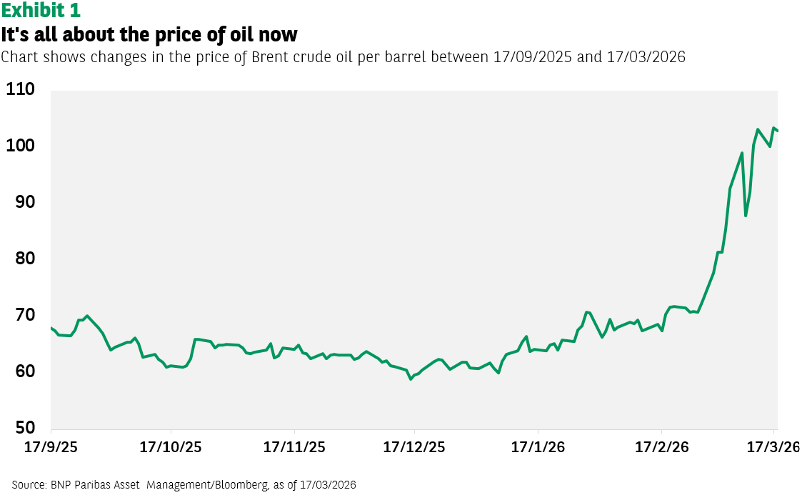 De sluiting van de Straat van Hormuz, door het Internationaal Energieagentschap omschreven als de "grootste verstoring van het aanbod in de geschiedenis van de wereldwijde oliemarkt", heeft de olieprijs met ongeveer 40% doen stijgen sinds de start van het conflict in het Midden-Oosten. Behoudens een plotse oplossing en heropening van de Straat, kan de energieschok nog verergeren. Dit kan vervolgens leiden tot hogere inflatie, wat op haar beurt het reële inkomen van consumenten en de winstgevendheid van bedrijven negatief kan beïnvloeden. Hoe langer dit duurt, hoe meer de groeivooruitzichten in gevaar komen. Vandaar dat de olieprijs bijzonder relevant is voor beleggers. Wat dit betekent voor de rendementen, zal afhangen van de omvang, breedte en hardnekkigheid van deze energieschok.