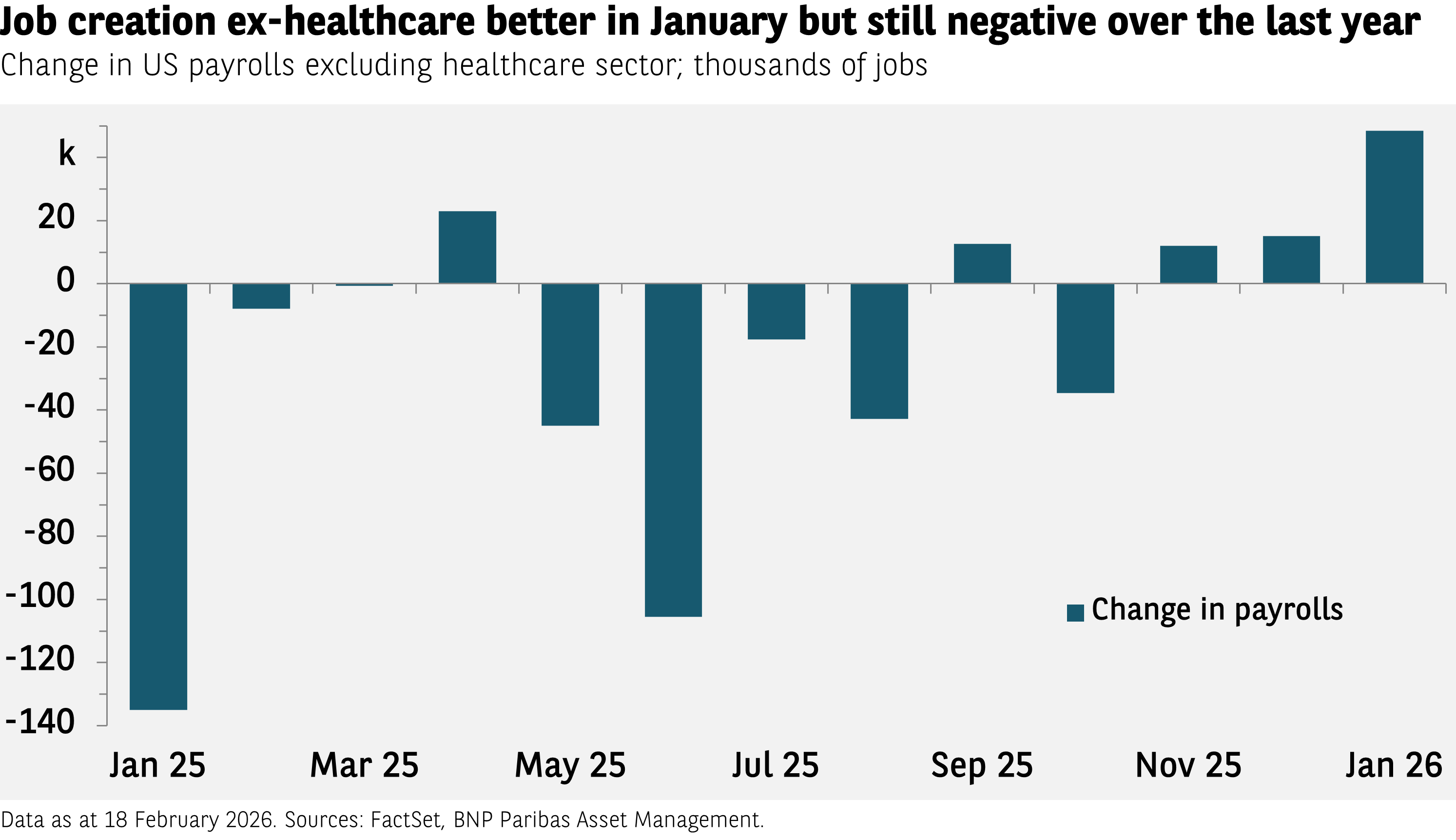 De recente banencijfers hebben de ongerustheid over de Amerikaanse jobcreatie gesust. Als we de gezondheidszorgsector buiten beschouwing laten (waar de jobcreatie al jaren sterk groeit), kwamen er 49.000 nieuwe banen bij in januari. Niettemin blijft het totaal van vorig jaar daardoor wel negatief. Sommige beleggers menen dat dit banenverlies een signaal is van een zwakke Amerikaanse economie. Wij denken dat het daarentegen een signaal van sterkte is. Het bbp groeit, maar de productie wordt met minder arbeid gegenereerd - wat betekent dat de productiviteit toeneemt. Waar gaan de ontslagen werknemers naartoe? Velen beginnen hun eigen zaak. We schatten dat er vorig jaar ongeveer 800.000 eenmanszaken opgericht werden.