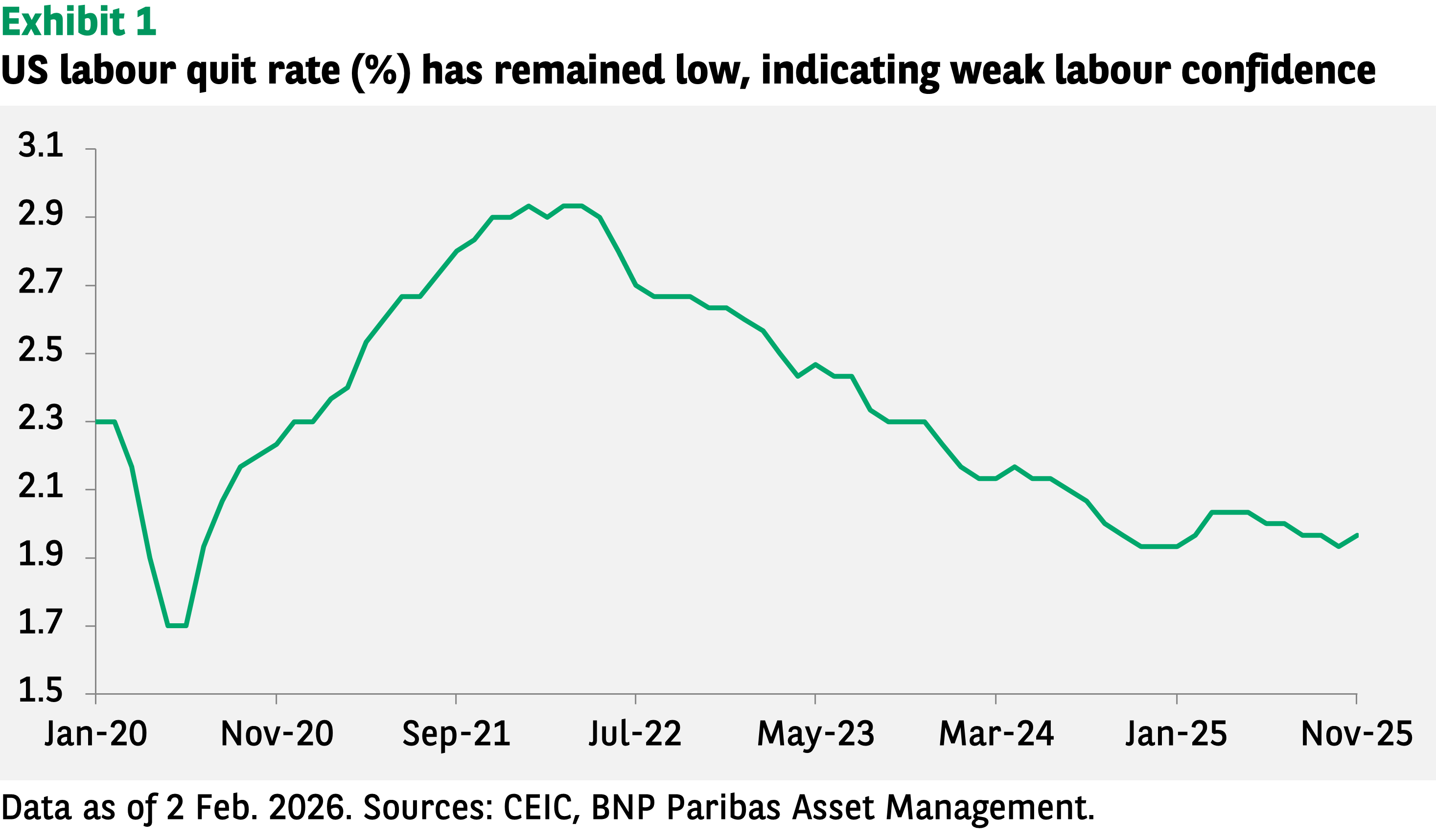 De beter dan verwachte banencijfers in januari zijn het nieuwste signaal dat de Amerikaanse arbeidsmarkt zich aan het stabiliseren is. De groei van het aantal jobs was echter op een smalle basis gestoeld, en dat weerspiegelt andere signalen dat er minder aangeworven wordt en dat de werkzekerheid erop achteruitgaat. Deze signalen wijzen op een laag vertrouwen, zo blijkt bijvoorbeeld uit het lage vertrekpercentage van 2%. Dit wil zeggen dat werknemers aarzelen om vrijwillig te vertrekken, omdat ze er weinig vertrouwen in hebben dat ze een nieuwe baan zullen vinden.